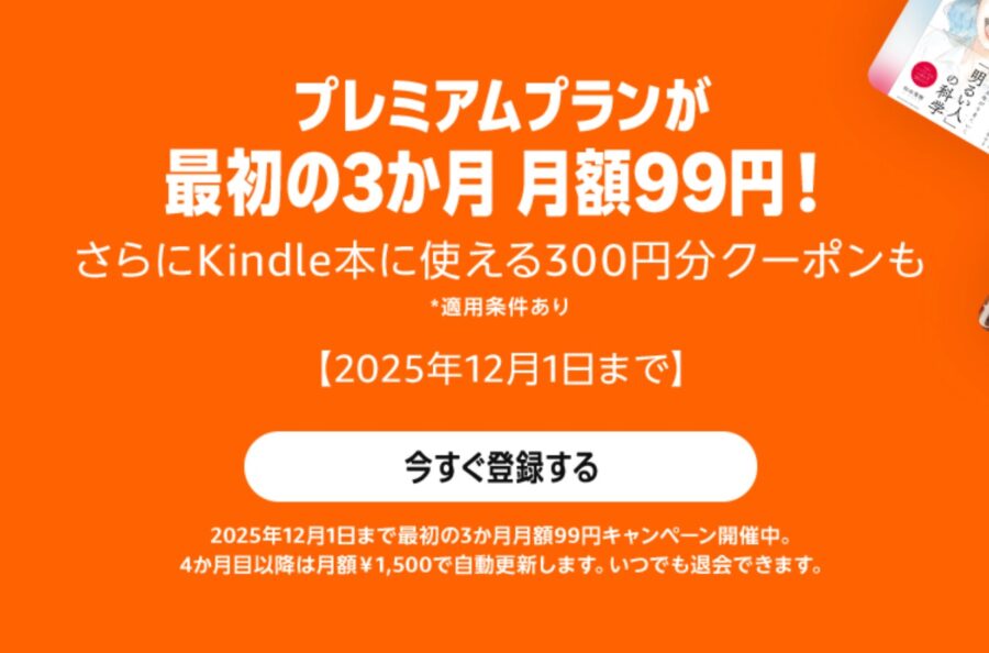 2025年12月1日まで開催中の、Audibleプレミアムプランが3ヶ月間月額99円で利用できる特別キャンペーンについてご紹介します。さらに嬉しいことに、今回のキャンペーンではKindle本購入に使える300円分のクーポンも付いてきますよ〜